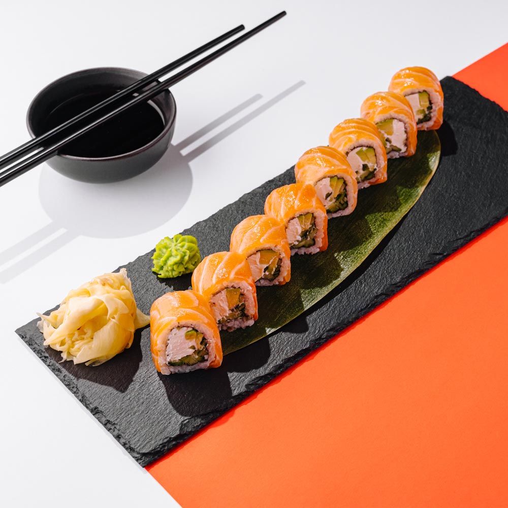Ролл с лососем, авокадо, огурцом и сливочным сыром.