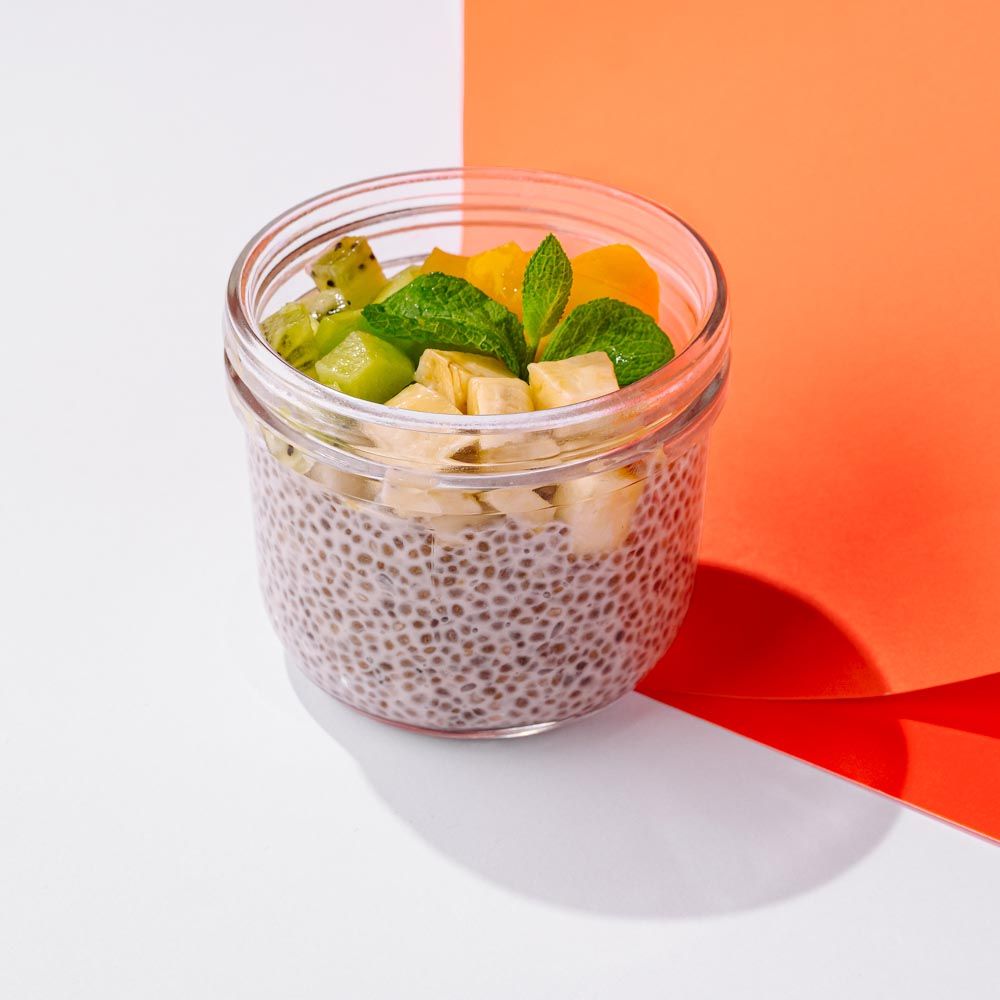 Чиа-пудинг на кокосовом молоке с манго, киви и бананом.
