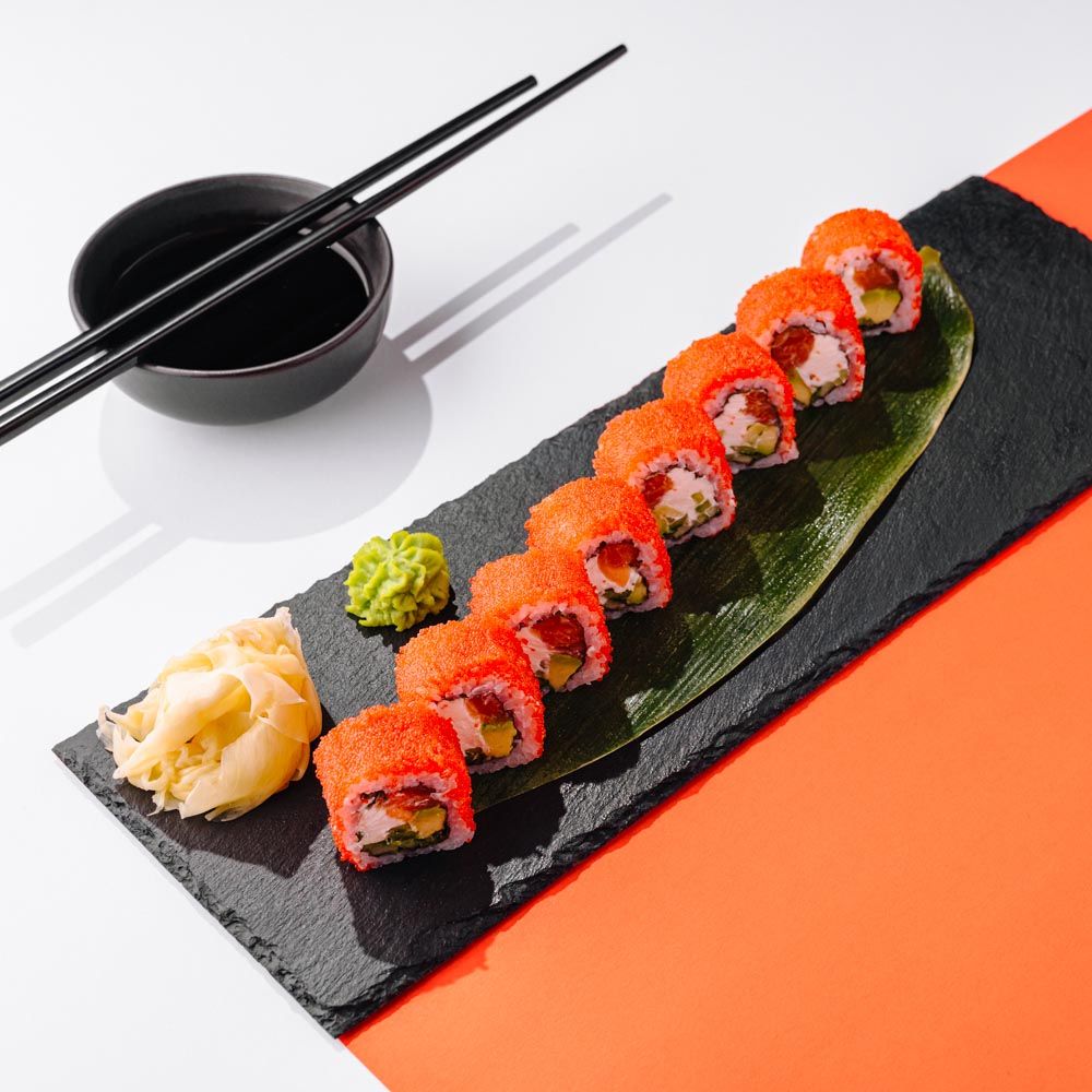 Ролл с лососем, авокадо, огурцом, сливочным сыром и икрой тобико.