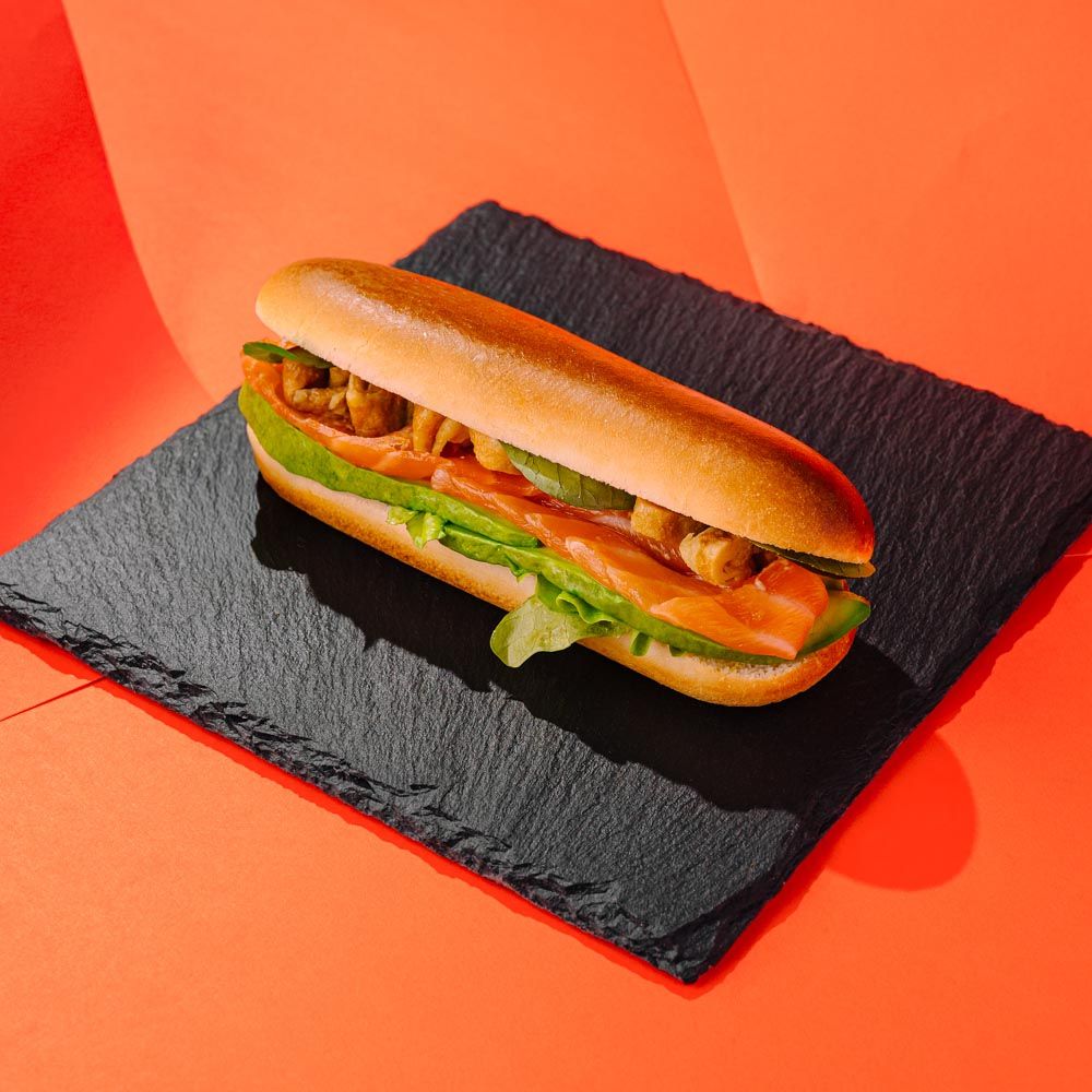 Тёплая булочка с лососем, авокадо, зелёным салатом и японским омлетом с ароматными соусами.