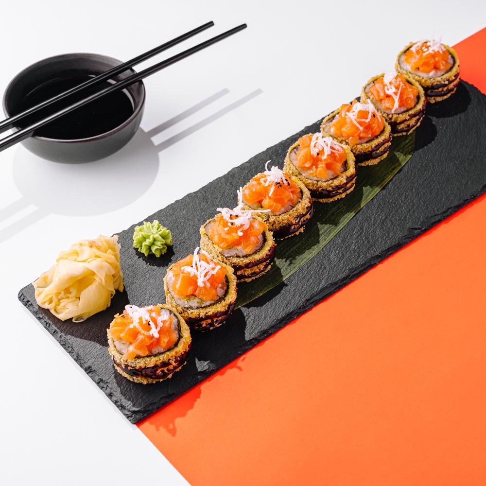 Темпура ролл с запечённым лососем, авокадо и сливочным сыром, с тартаром из лосося, соусом унаги, соус манго и кунжутом.